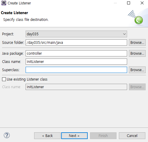 Finish 클릭 시 리스너 클래스가 만들어진다.