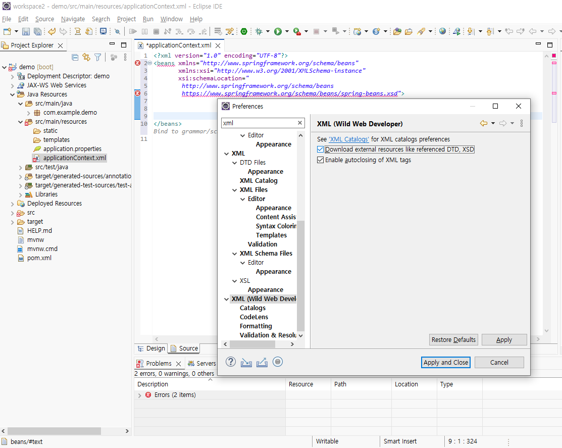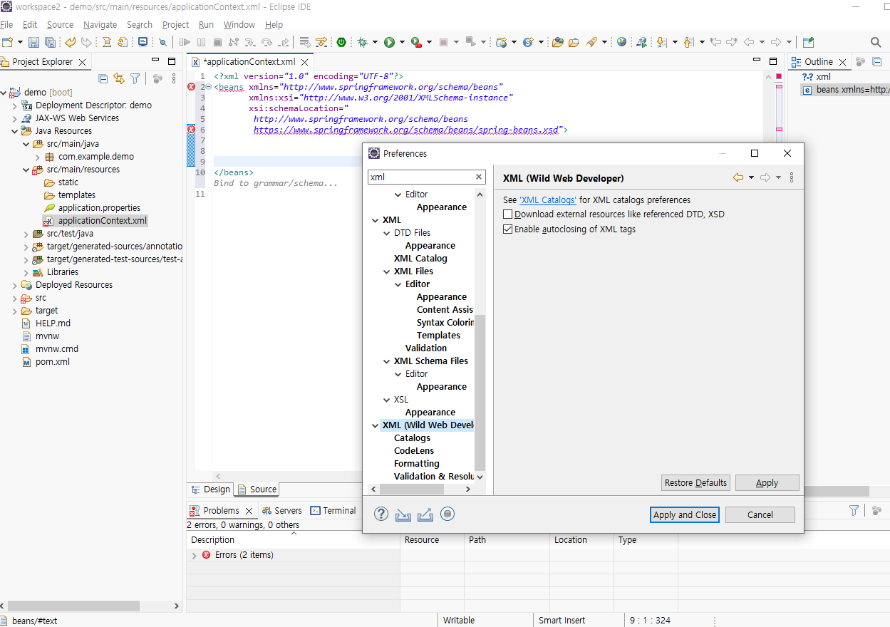 빨간줄이 뜬다면 윈도우 > 프리퍼런스 선택 후 > xml 검색