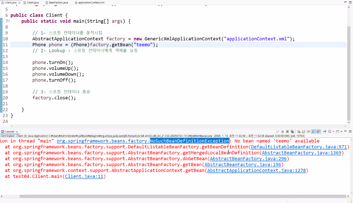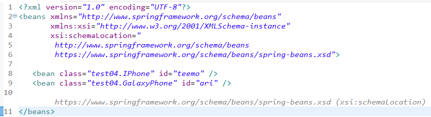 <bean class="test04.IPhone" id="teemo" /> 를 추가하자!
