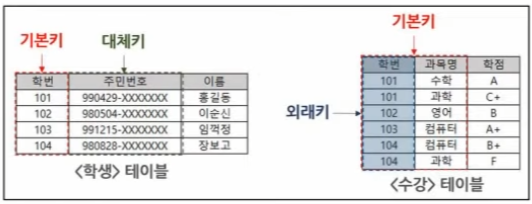 - 슈퍼키 ⊃ 후보키 ⊃ 기본키/대체키