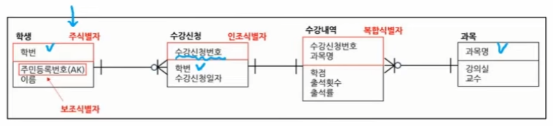 (학번, 이름, 과목명) - 관계: 엔터티 사이 연관성