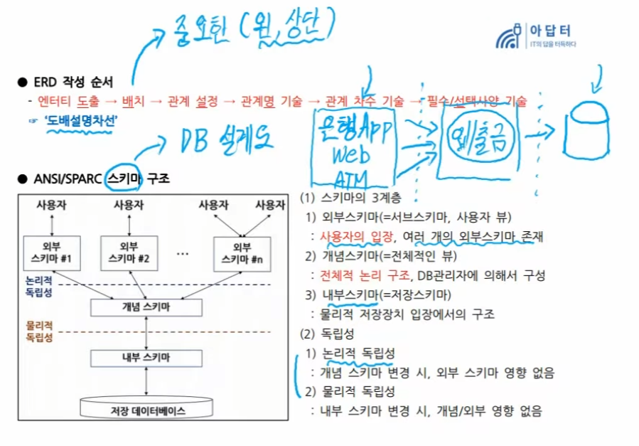 - 외부 스키마: 사용자 관점(앱/웹/ATM 등)